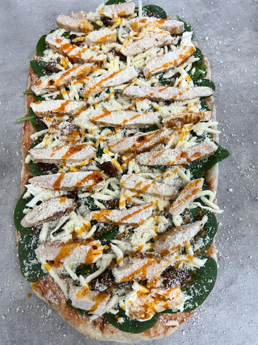 Tomatensaus, mozzarella, verse spinazie, gedroogde tomaatjes, kipreepjes, mascarpone, parmezaanse kaas, pittige olie.