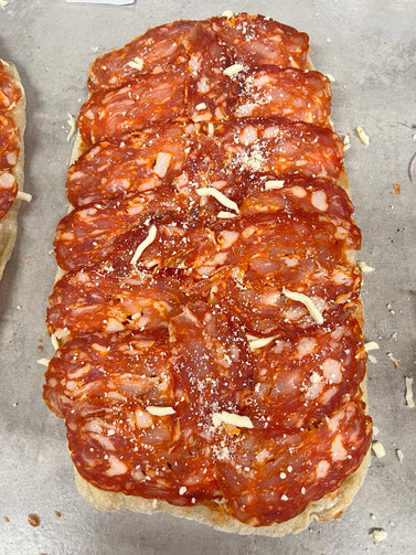 Tomatensaus, citroenricotta, mozzarella, pittige salami