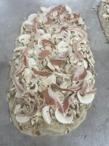 ('Bianca', zonder tomatensaus) - Truffelmascarpone, mozzarella, champignons, witte ui, pancetta, rucola
