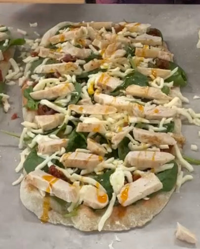 Tomatensaus, mozzarella, verse spinazie, gedroogde tomaatjes, kipreepjes, mascarpone, parmezaanse kaas, pittige olie