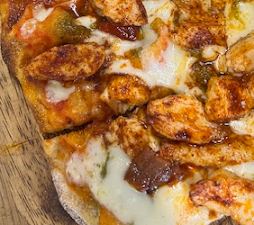 Tomatensaus, basilicum, pesto, mozzarella, kipreepjes, gerookt paprikapoeder, parmezaanse kaas.