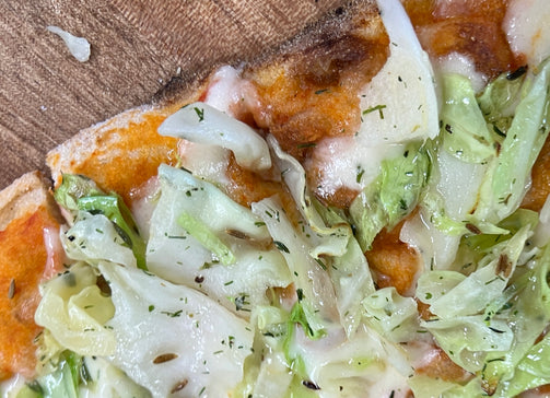 Tomatensaus, mozzarella, spitskool, olijfolie, knoflook, dille, tijm, komijnzaadjes.