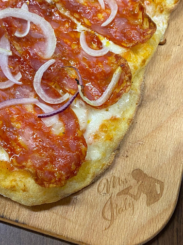 Tomatensaus, truffelolie, mozzarella, provolone, peper en zout, salamino piccante, rode en witte ui.