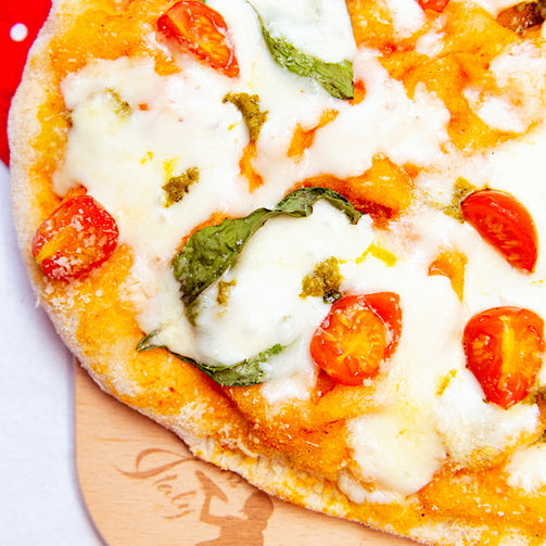 Tomatensaus, basilicum, mozzarella, buffelmozzarella, cherrytomaatjes