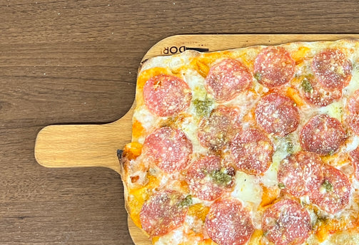 tomatensaus, mozzarella, pesto salami, parmezaanse kaas