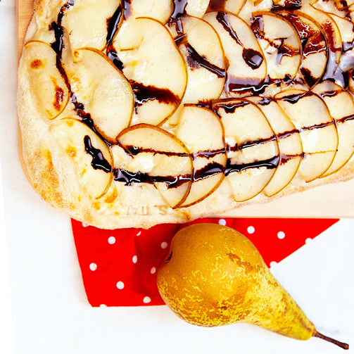 Mozzarella, peer, gorgonzolacremesaus, gorgonzola - balsamicosiroop