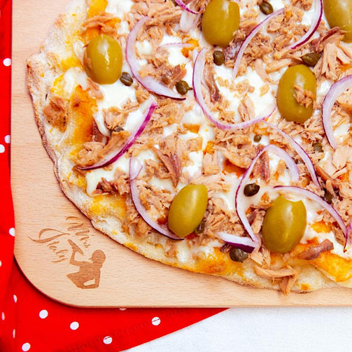Tomatensaus, mozzarella, tonijn, kappertjes, rode ui, ansjovis, olijven